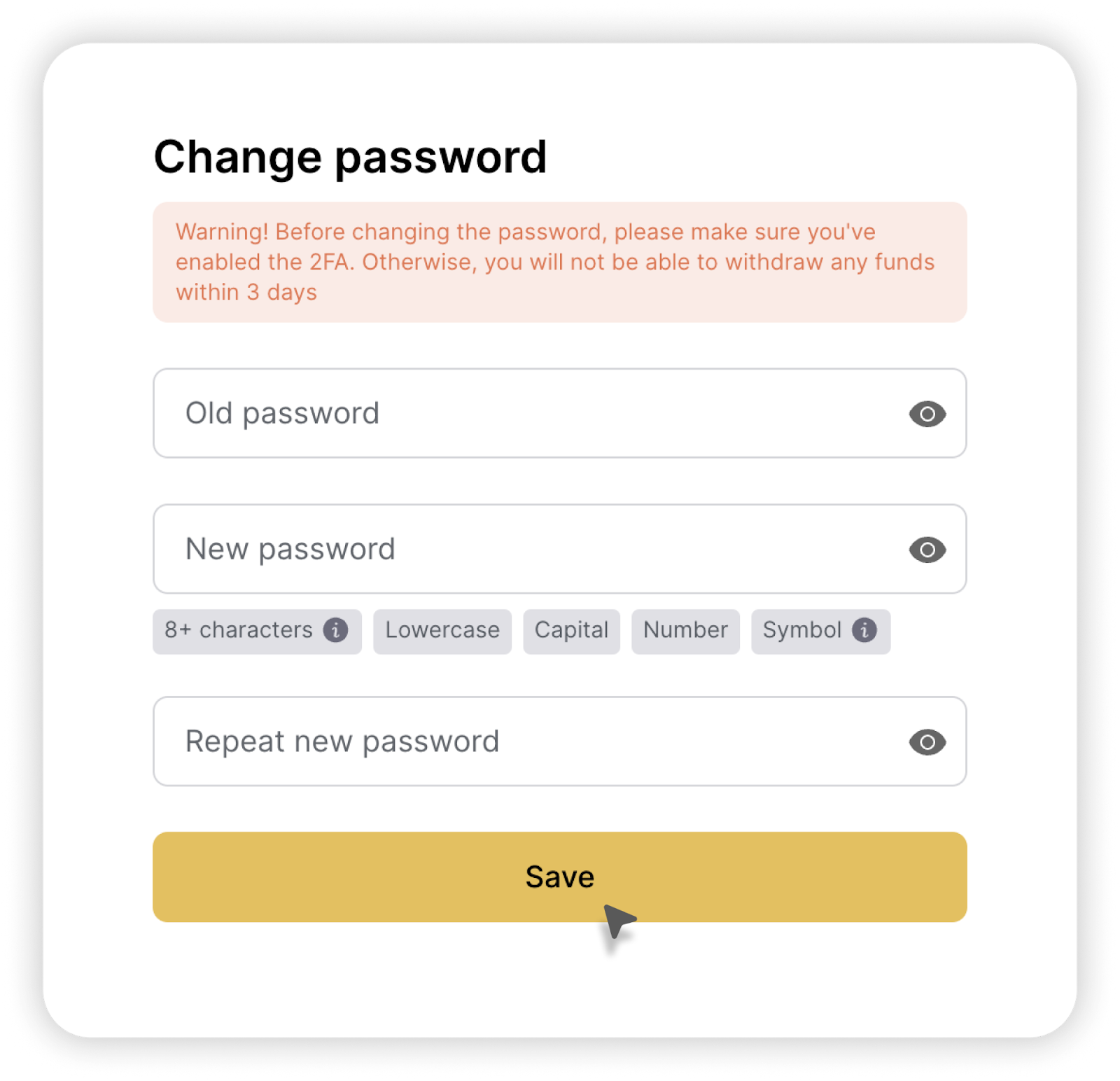 Please note: If you do not have 2FA or Passkey activated, withdrawals will be restricted for 72 hours after the password change. We recommend securing your account and enabling two-factor authentication, which will also allow you to withdraw funds immediately after changing your password.