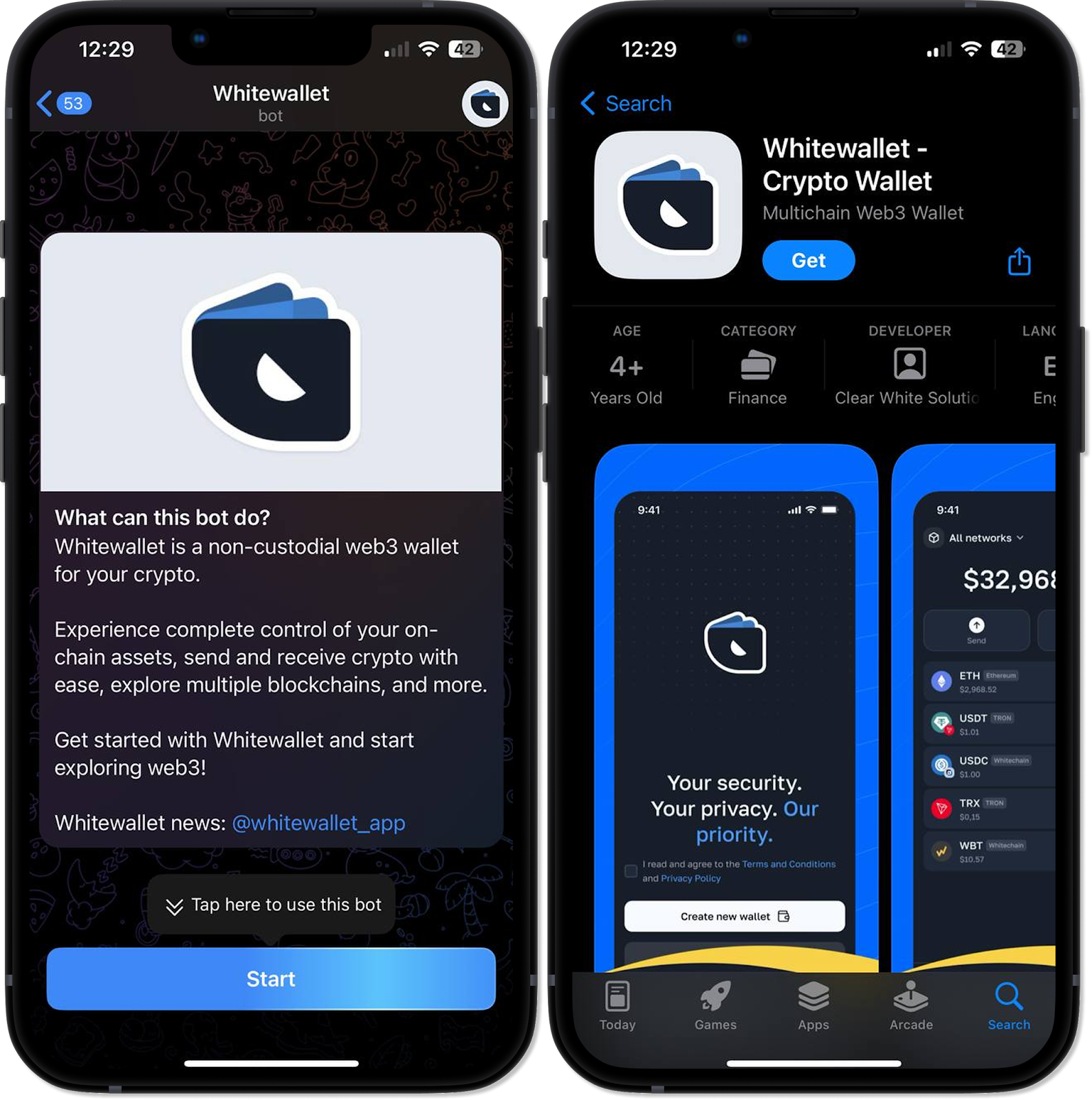 Whitewallet is a wallet app inside the Telegram bot and is available for download on Google Play and the App Store. This wallet allows you to easily manage your funds, make instant deposits and withdrawals, receive and send NFT, without leaving the messenger.