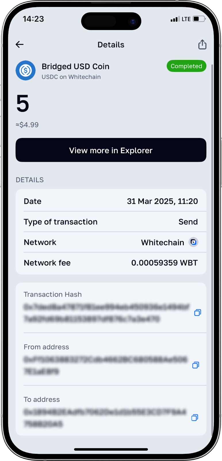 By clicking on the hash or one of the addresses, you will automatically be redirected to the explorer page (http://explorer.whitechain.io/).