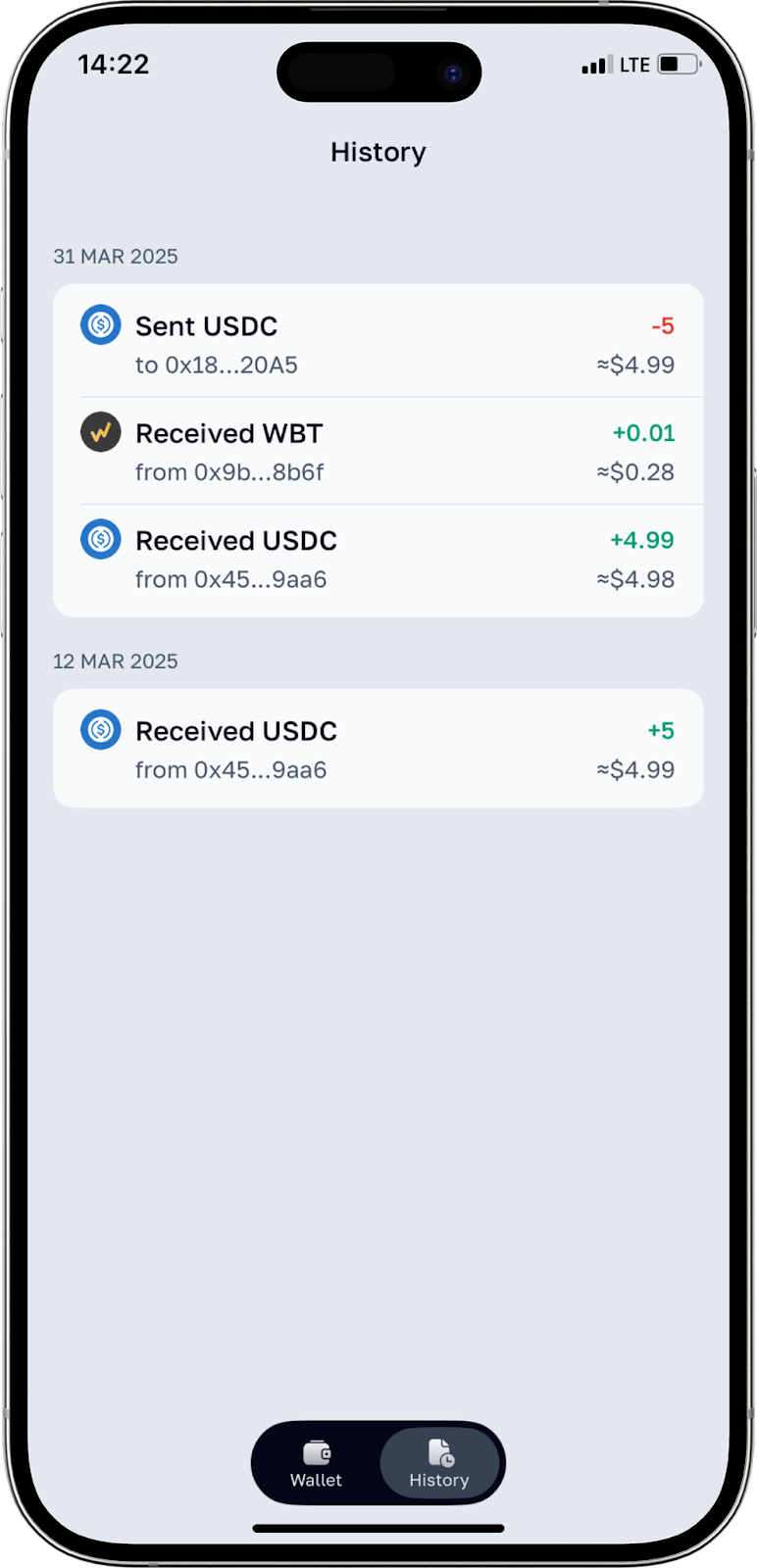 In order to see a list of all transactions, click on the “History” section on the home page.