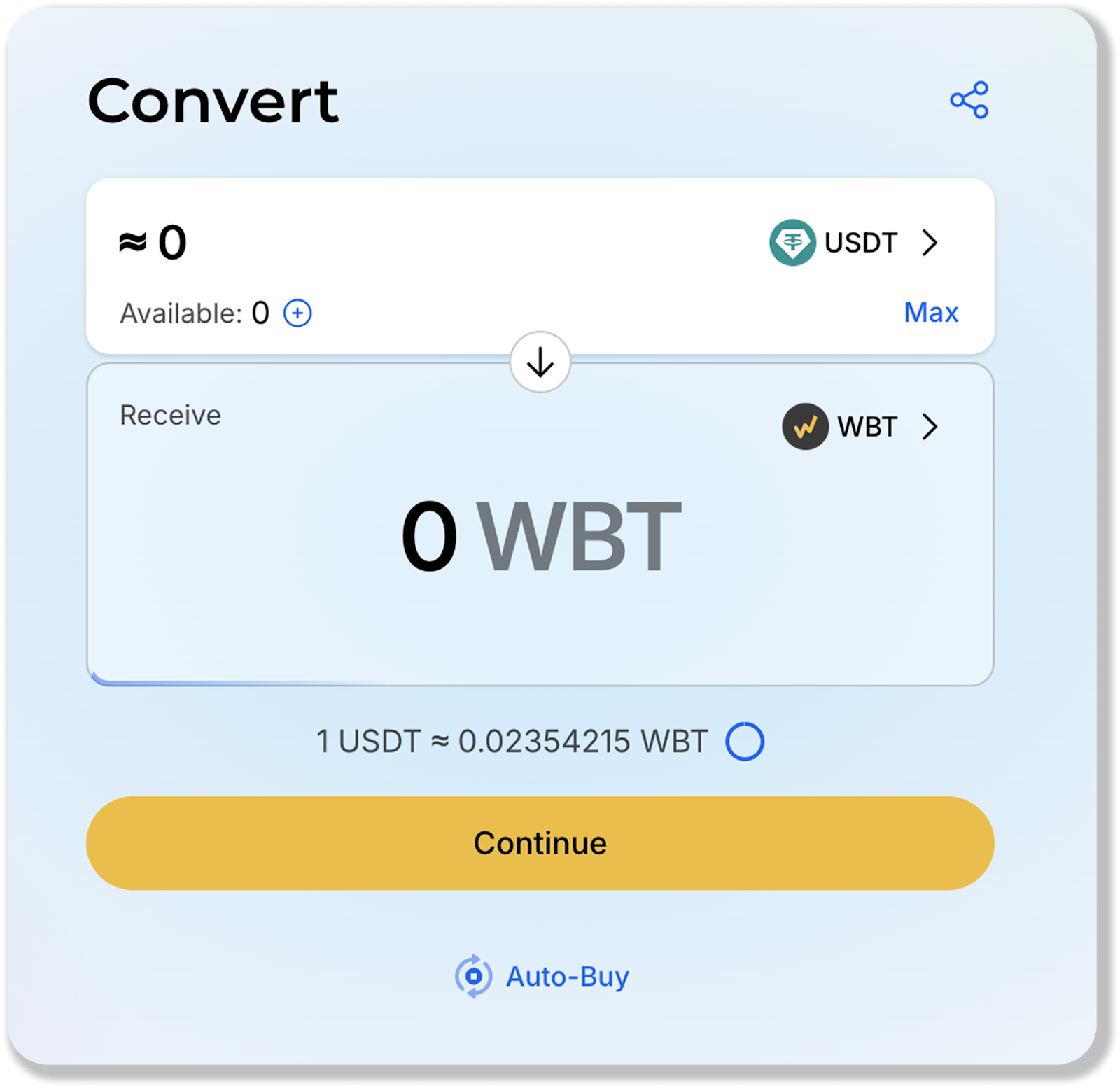 1. Using the Convert function. Exchange an asset suitable for you for a WBT token. You can familiarize yourself with the exchange function in this article.
