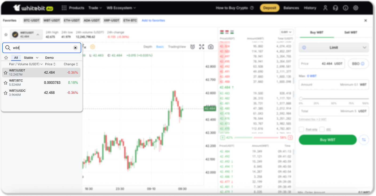 Now that you have one of the currencies on your balance, use the pair that suits you by placing an order to buy WBT: WBT/BTC, WBT/USDT.
