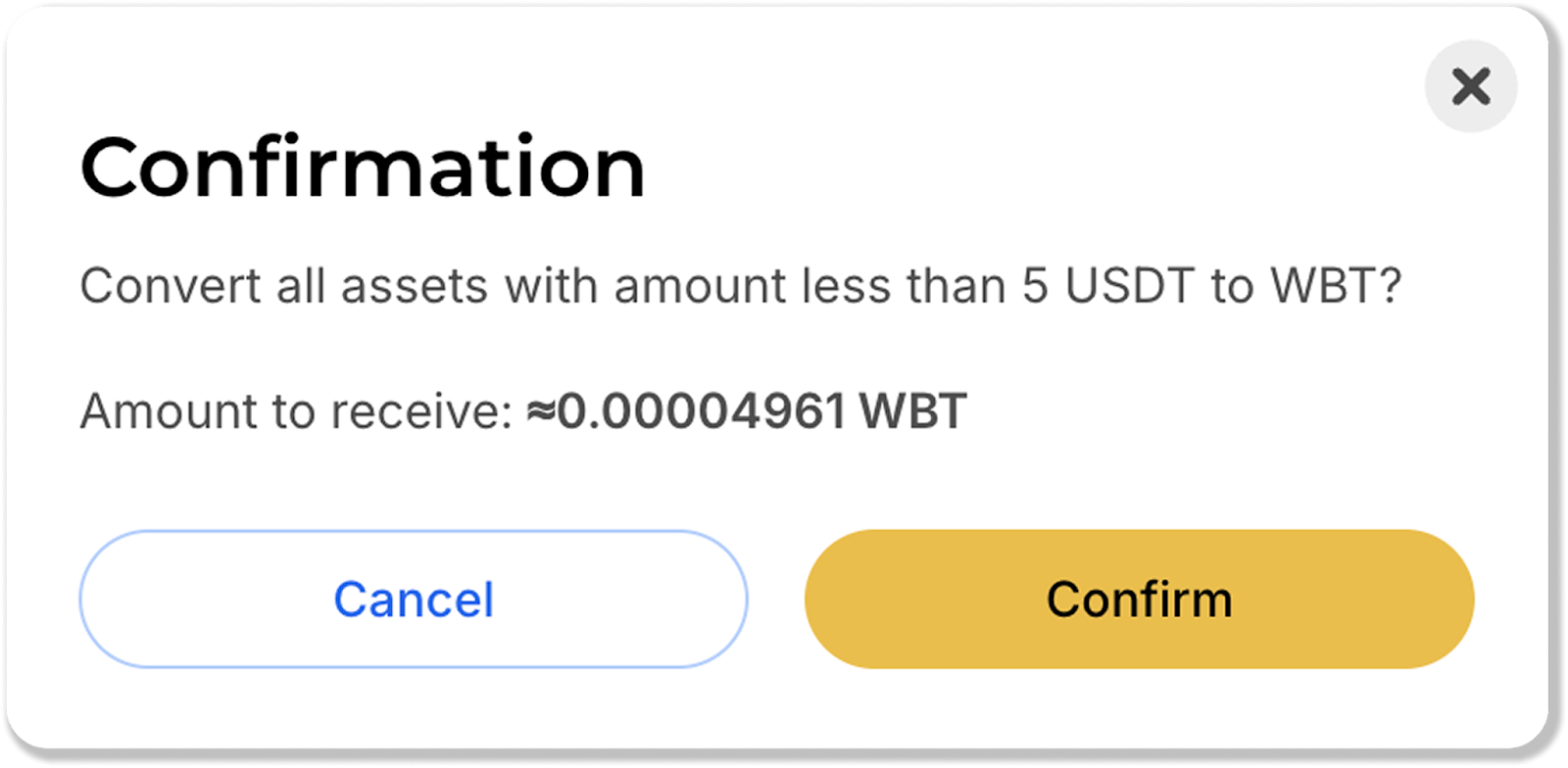 This function allows you to convert all funds, the amount of which is less than 5 USDT (minimum order amount) into WBT.
