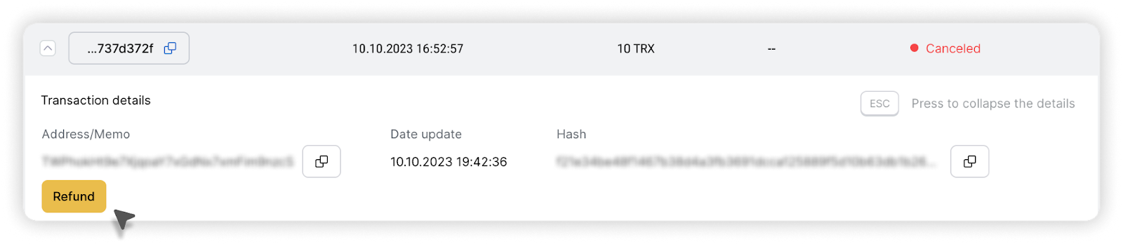 As soon as your transaction gets the status "Canceled", you can create a request for Refund. To do this, go to the "History/Deposits" section.