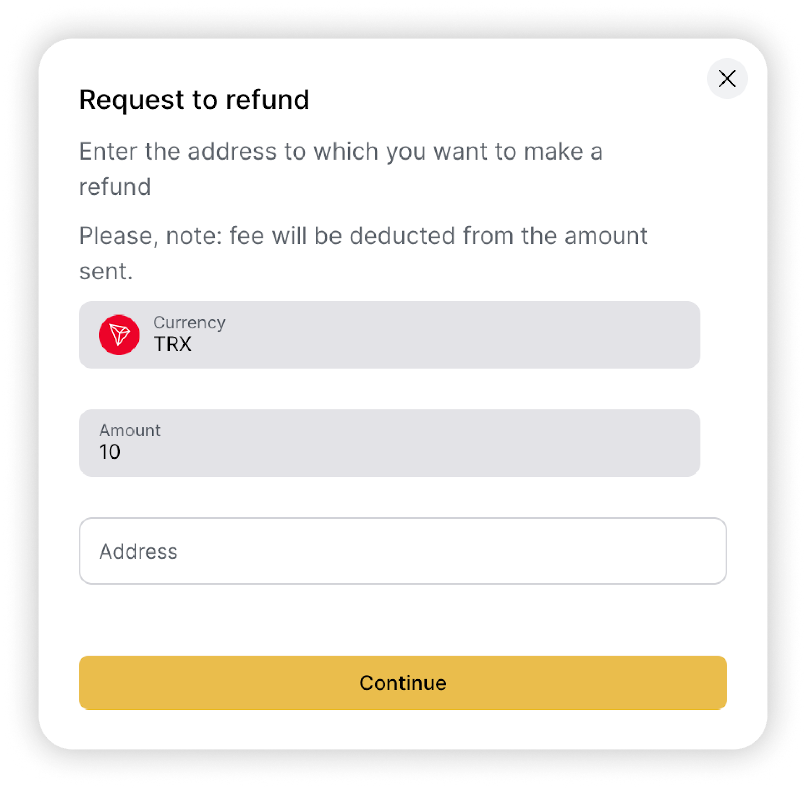 Please note! The address you provide for the refund must not belong to our exchange. Also, please make sure that all the details are correct, as this transfer cannot be canceled or resent once confirmed.