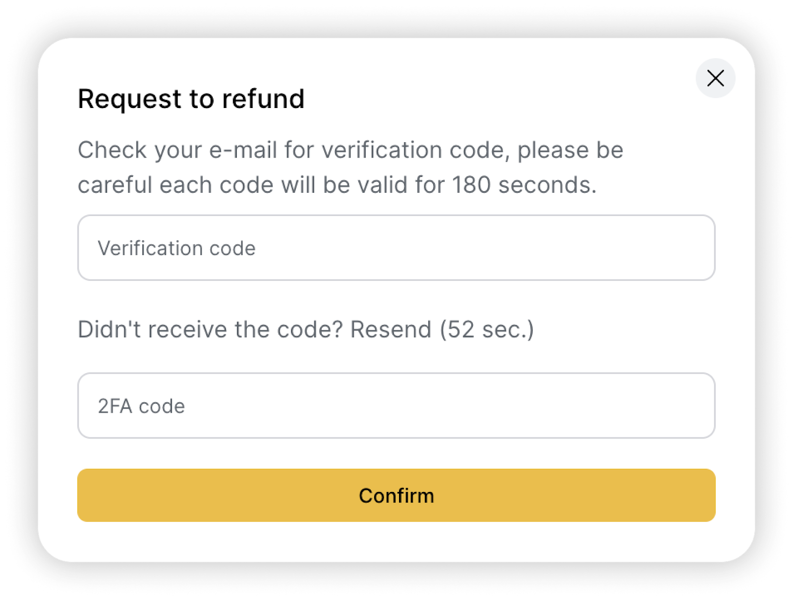 3. Confirm the creation of the "Refund" application. You will receive a code by email. Enter it in the appropriate field in the confirmation window. You will also need to enter the 2FA code (if the function is enabled on your account).