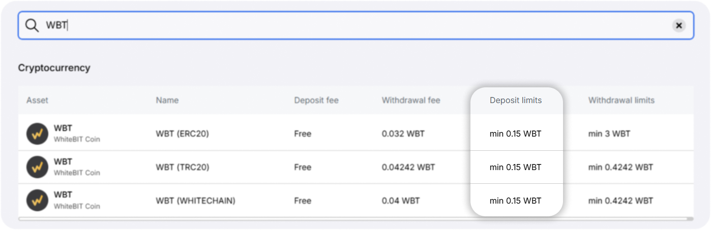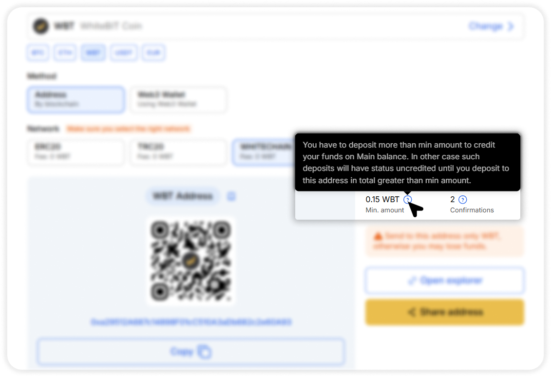 For example, you have made a deposit of 0.12 WBT in the WHITECHAIN network, but the minimum deposit amount is 0.15 WBT. In this case, you have to send an additional 0.03 WBT to the same address in the WHITECHAIN network. The address is displayed on the deposit page.