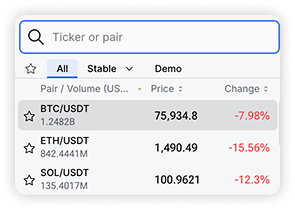 In the upper left part of the trading terminal, you can select from a range of trading pairs. To help find the ticker or pair you want, try the search bar or have a look at the categories underneath to filter the list. Next to the selected pair, you can see brief statistics, including trading volume and rate changes over the last 24 hours.