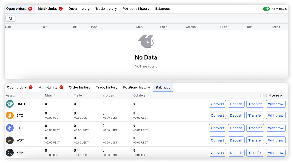 Open orders, History and Balances