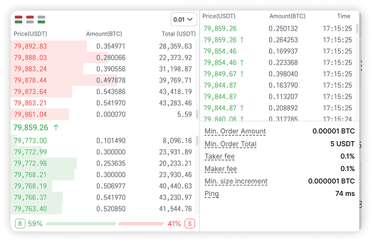 The right side of the trading terminal contains the orderbook. This tool displays a list of buy and sell orders for an asset in real time. It helps traders assess market liquidity, identify possible support and resistance levels, and make decisions on entering and exiting trades.