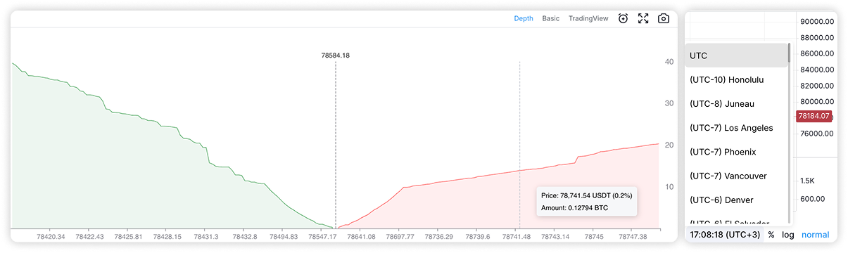 In the upper right side of the chart, you will find the option to select the chart type. The available options include the Basic chart and the TradingView chart. Selecting the TradingView chart provides access to additional analysis tools such as indicators and charting tools. You can also analyze the market depth (orderbook) by switching to the Depth chart.