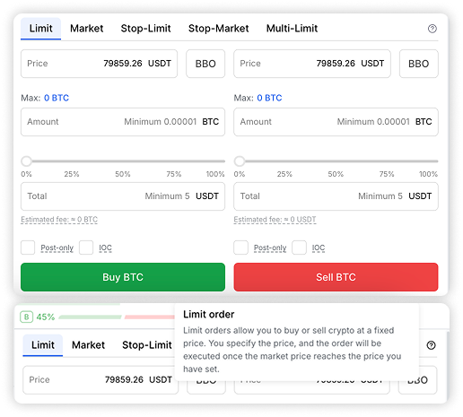 - Post-only – ensures that the order will be added to the order book as a limit order and not executed immediately.