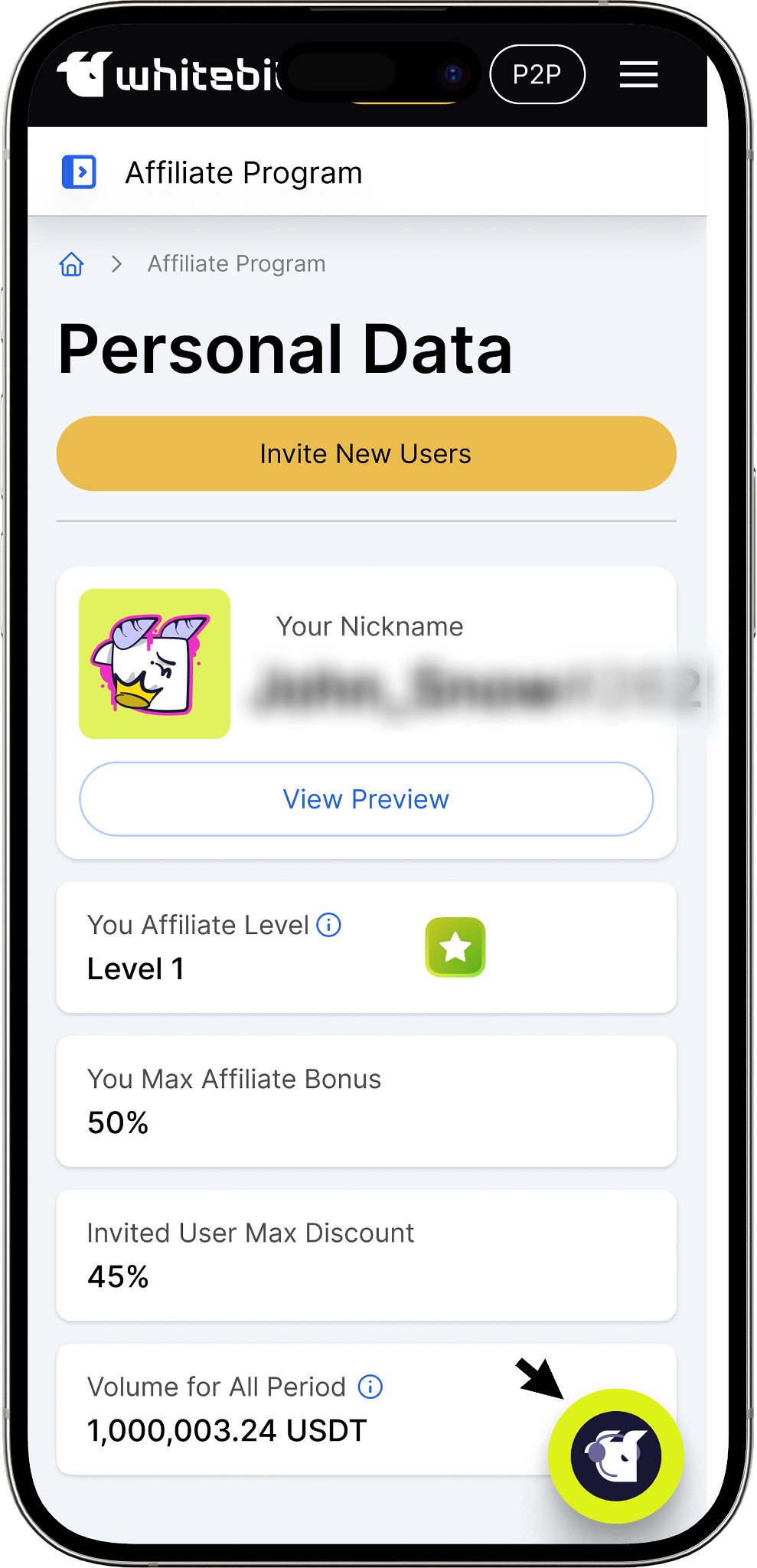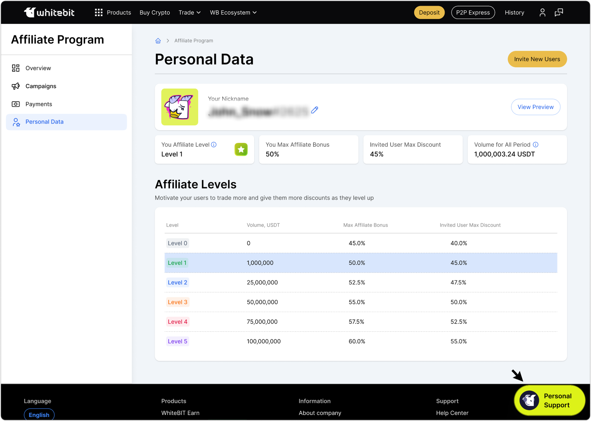 To access the affiliate-level system, navigate to the “Personal Data” section within the Affiliate Programme panel. Here, you'll find a detailed overview of your current affiliate level, the maximum affiliate bonus you can earn, and the maximum discount available for your invited users.