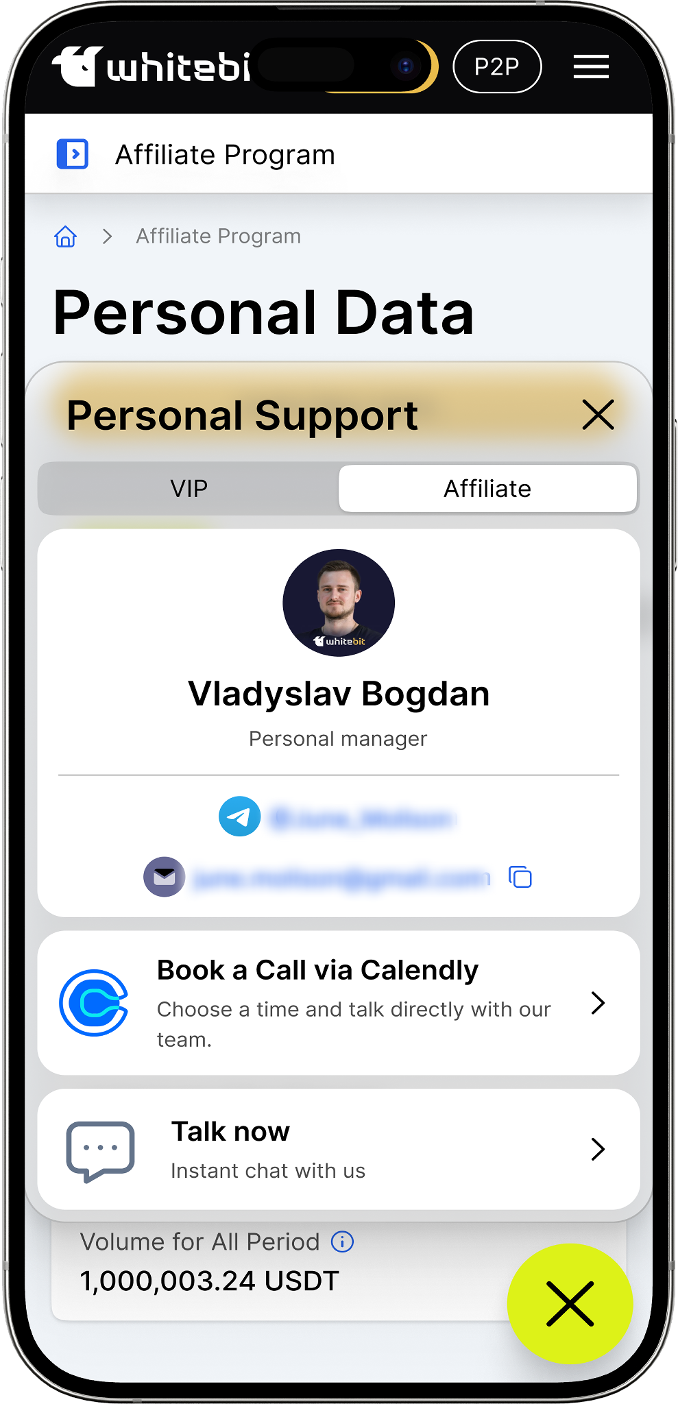 As part of the Affiliate program, users have access to a Personal Support widget that provides direct communication with their personal affiliate manager.