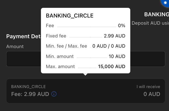 We also recommend checking the information about the minimum deposit amount by hovering over the icon next to the fee percentage.