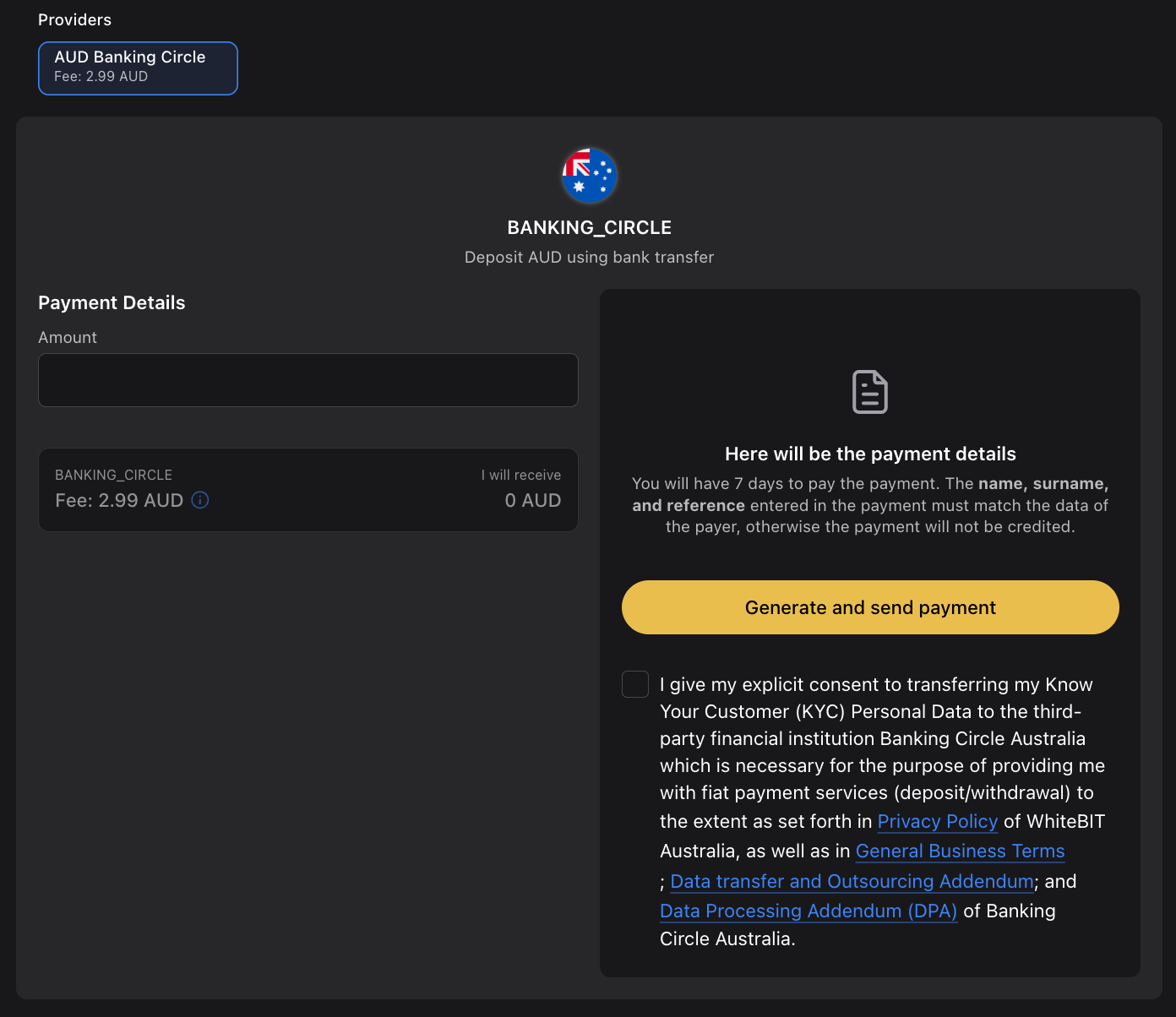 Enter the deposit amount in the “Amount” field and click the “Generate and send payment” button. To send funds, copy bank details from the “Payment sent” window and paste it into your banking application. Payment details are generated individually for each deposit.