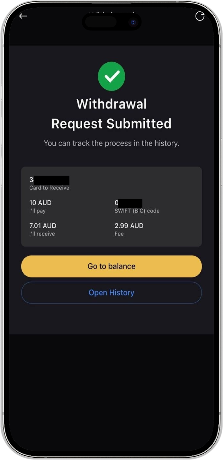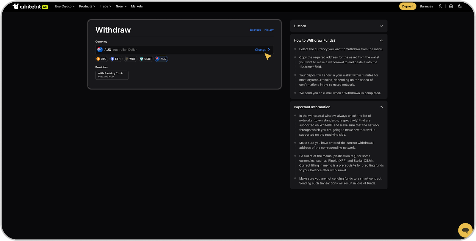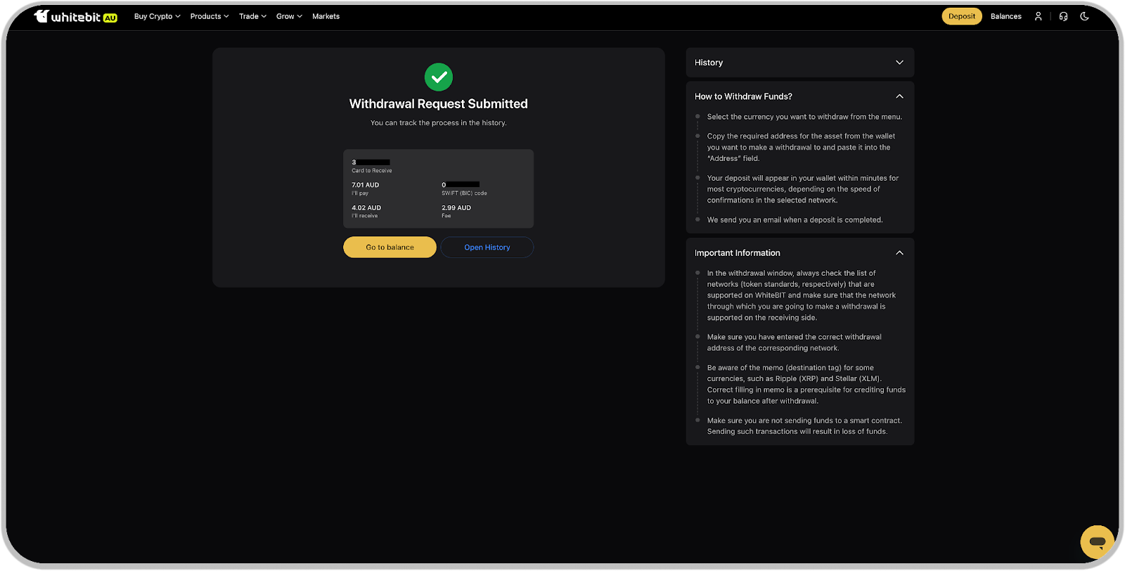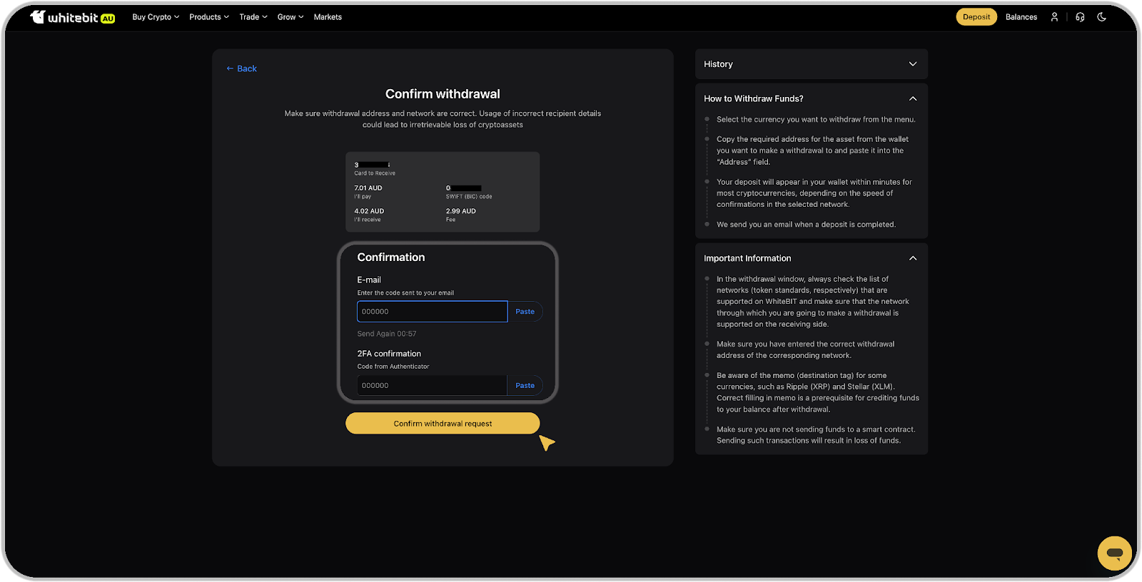 Any withdrawal in your WhiteBIT Australia account is displayed in the "History" in the "Withdrawals" section and the funds are withdrawn from the "Main" balance.