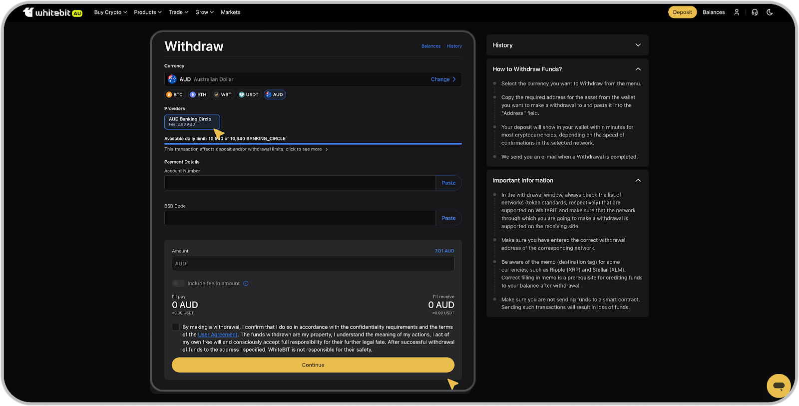 How to make a withdrawal of AUD using a website?