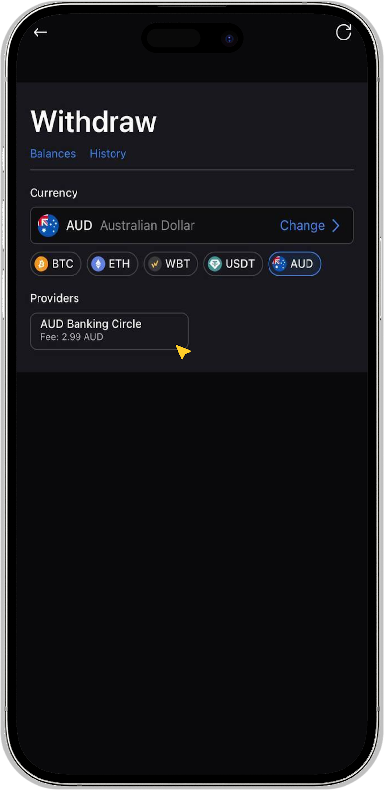 Click the "Withdrawal" button in the "Wallet" tab and select AUD from the list of available currencies.